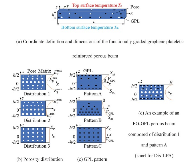 圖1. FG-GPL多孔梁的尺寸、孔隙率分布和GPL色散模式。