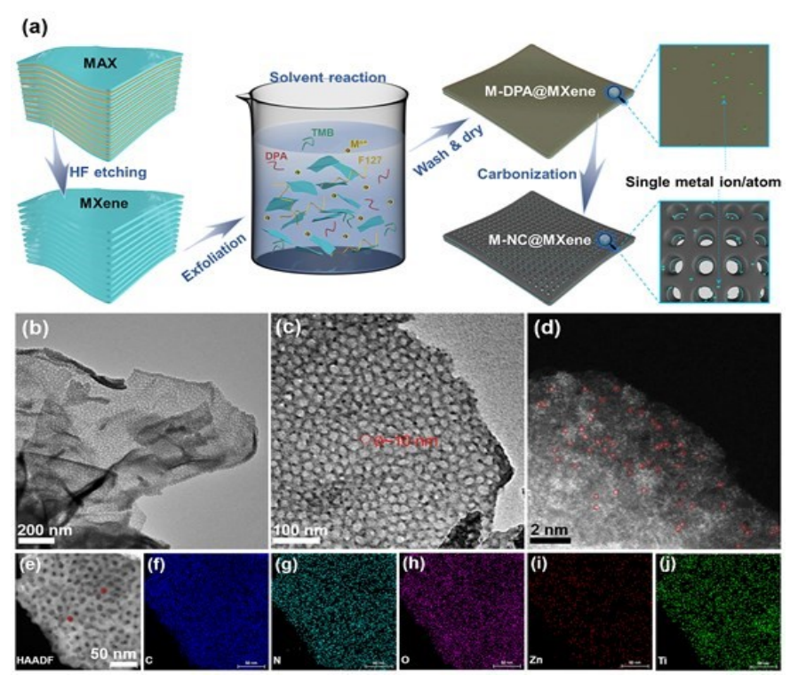 Fig 1. (a) M-NC@MXene 納米片的制備示意圖。 Zn-NC@MXene 納米板的形態(tài)和結(jié)構(gòu)特征:(b,c)TEM 圖像,(d)Cs 校正的 TEM 圖像,(e)HAADF 圖像和(f-j)相應(yīng)的 EDS 圖案。