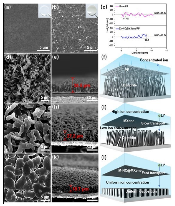 -2 Li 后陽極的 SEM 圖像和示意圖:(d-f) 裸 PP、(g-i) MXene/PP 和 (j-l) Zn-NC@MXene/PP。