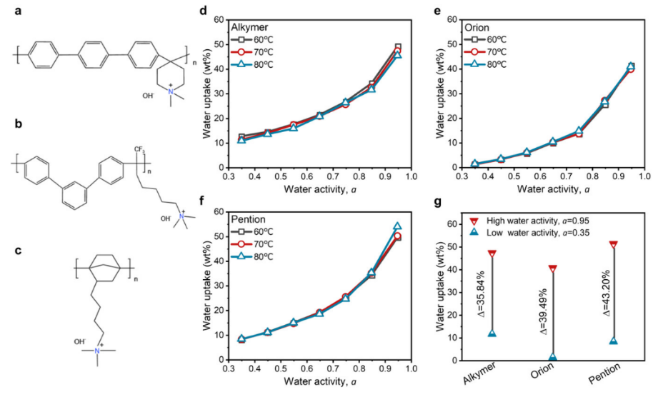 Fig 1. 不同 AEM 的化學結(jié)構(gòu)和吸水特性。a) Alkymer的結(jié)構(gòu)。b) Orion的結(jié)構(gòu)。c) Pention的結(jié)構(gòu)。d) Alkymer的吸水率。e) Orion的吸水率。f) Pention 的吸水率。g) 三種膜的吸水率比較。