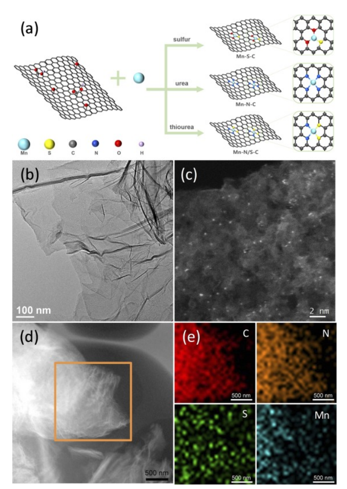 Fig 1. (a) Mn-SC、Mn-NC 和 Mn-N/SC 的合成示意圖。(b) Mn-N/SC 的 TEM 圖像。(c) Mn-N/SC 的 HAADF-STEM 圖像。(d) STEM 圖像和 (e) Mn-N/SC 的 EDS 元素圖。