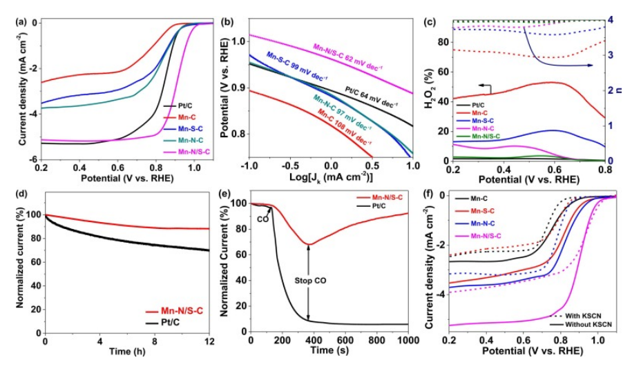 2產(chǎn)率。(d) Mn-N/SC 和 Pt/C 在 0.6 V 時(shí)的計(jì)時(shí)電流響應(yīng)。(e) Mn-N/SC 和 Pt/C 在 0.6 V 時(shí)對(duì)一氧化碳的耐受性。(f) Mn- 的 ORR 極化曲線C、Mn-SC、Mn-NC 和 Mn-N/SC,不含(實(shí)線)和含(虛線)10 mM KSCN。