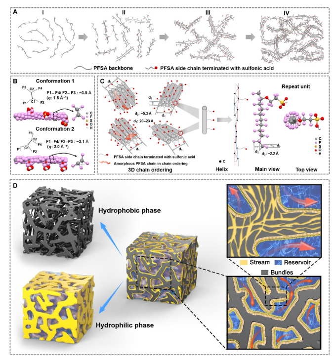 -1 )。( D ) SSC-PFSA膜結(jié)構(gòu)三維示意圖:灰色區(qū)域代表疏水相,黃色區(qū)域代表親水相。