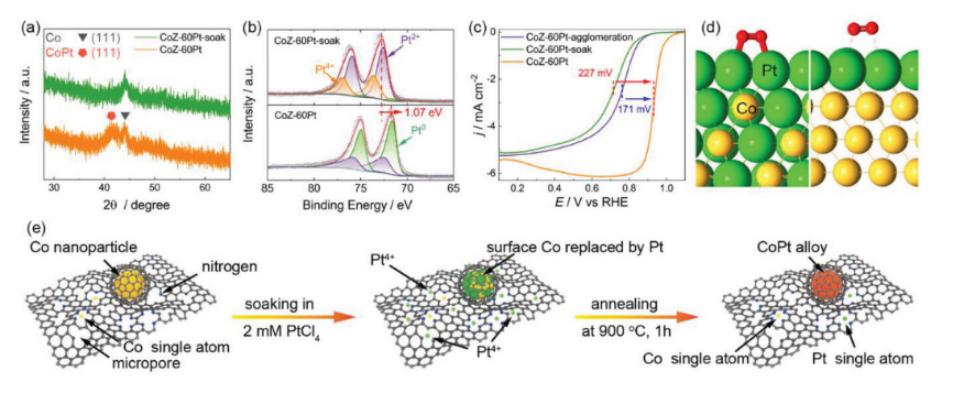 Fig 3. CoPt催化劑退火前后的(a)XRD和(b)XPS圖,(c)不同催化劑的LSV曲線,(d)不同Pt基金屬表面對氧氣分子的吸附示意圖,(e)小尺寸CoPt納米合金制備流程示意圖。