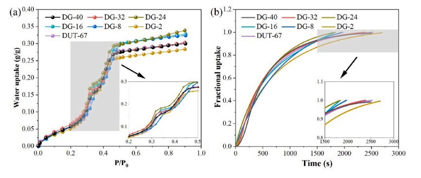 圖5. DUT-67和DUT-67/GO復合材料的(a) 水吸附等溫線(298K)和(b)動力學(303K,0.84kPa)。