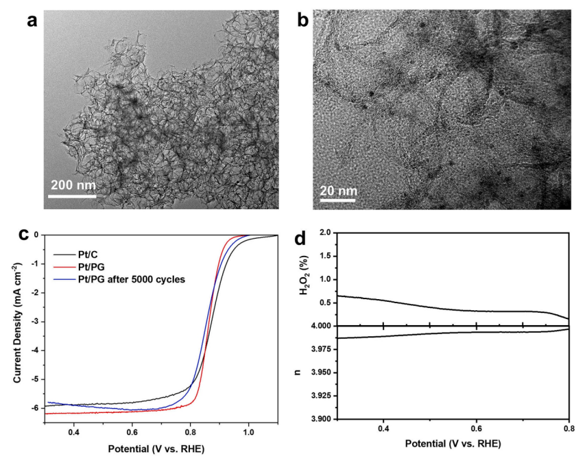 圖4. Pt/PG的(a) TEM和(b)HRTEM圖像;(c) Pt/PG和Pt/c的LSV曲線;Pt/PG的(d) H