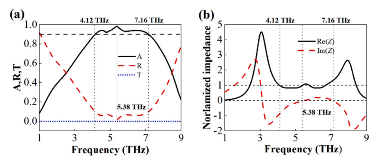 圖3. 模擬法向TE-偏振入射波下(a)GMSA的透射、反射、吸收光譜和(b)計算的歸一化等效表面阻抗。