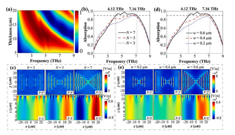 N時GMSA的電場分布。(d)不同GSRs間隙距離w的吸收光譜。(e)不同w時GMSA的電場分布。