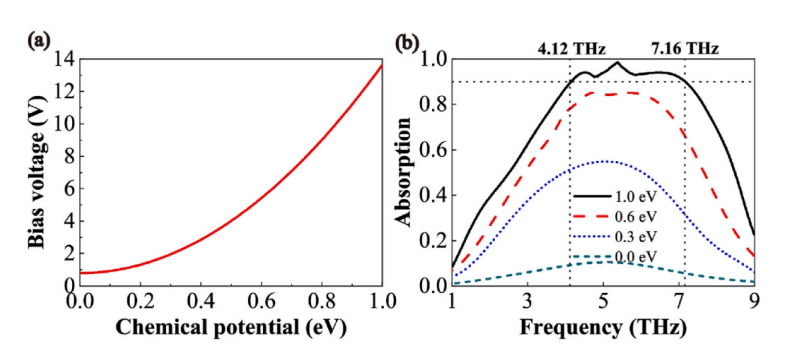 圖6. (a) 施加的外部電壓與化學勢的關系。(b) GMSA在0.0eV-1.0eV的不同化學勢下的吸收光譜。