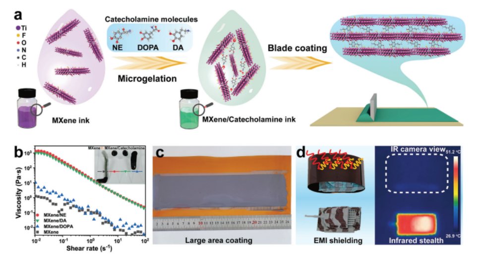 圖1. a) MXene/兒茶酚胺油墨和涂料的制作示意圖。b) MXene/NE、MXene/DA和MXene/DOPA油墨的不同粘度(插圖:傾斜滑動上的油墨流動性)。c)大面積MXene/兒茶酚胺涂層。d) MXene基涂層的電磁干擾屏蔽和紅外隱身應(yīng)用。