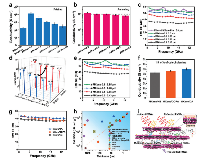 圖4. a)過濾后的MXene膜與不同DA含量的d-MXene-x膜的電導(dǎo)率比較。b)不同DA含量的退火處理d-MXene-x涂層的電導(dǎo)率。c)不同厚度的d-MXene-0.5涂層和6 μm厚度的過濾MXene膜的EMI性能。d) d- mxene -x涂層退火前后EMI SE比較。e)退火后不同厚度的d-MXene-0.5涂層的EMI SE。f)約1 μm的MXene/NE-1.5、MXene/DOPA-1.5和MXene/DA- 1.5涂層的電導(dǎo)率和g) EMI SE。h) d-MXene涂層與各種導(dǎo)電膜以及不同厚度涂層(包括MXene、石墨烯、CNT和金屬箔)的EMI SSE/t比較。i)電磁干擾屏蔽機理示意圖。