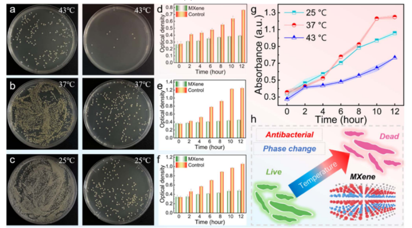 圖9對照(左)和MXene(右)組在不同溫度(a) 43℃、(b) 37℃和(C) 25℃下對金黃色葡萄球菌的抗菌測試圖像。金黃色葡萄球菌在不同溫度下的OD再生數據:(d) 43°C, (e) 37°C, (f) 25°C。(g)不同溫度下金黃色葡萄球菌OD再生曲線的比較。(h)溫度和MXene的抗菌作用說明。