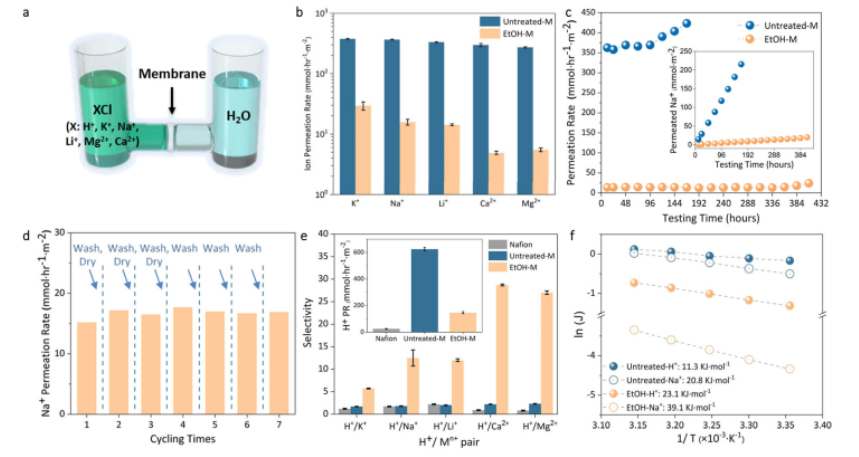 x通道可以建立多個氫鍵,其小于1納米的尺寸通過保持溶劑-MXene距離和溶劑取向來誘導納米約束效應,從而大大加強了這些相互作用。在亞1-nm離子篩選和分離中,修飾后的膜表現出穩定的離子排斥和質子化(H+/Mn+)選擇性,分別比原始膜高50倍和30倍。它證明了非共價方法作為一種廣泛的修飾替代方法在能源、資源和環境相關應用中的納米通道的可行性。