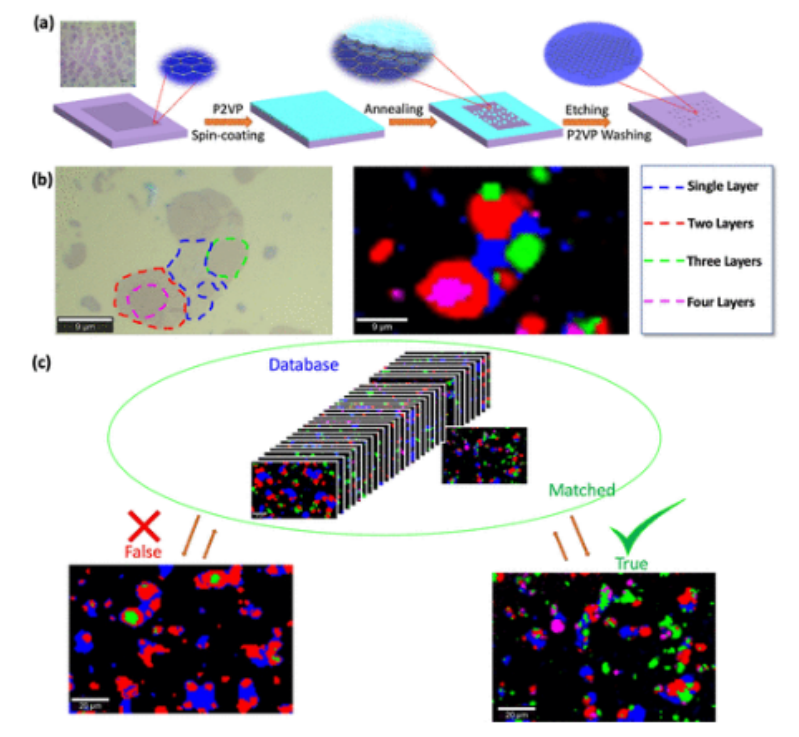 圖1.石墨烯PUFs的制備。(a) 制造工藝示意圖。(b) OM圖像和相應的拉曼映射圖像。(c) 身份驗證的代表性插圖。