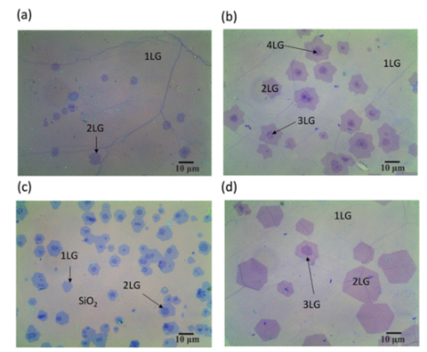 2的不同流速下生長的石墨烯樣品的OM圖像。前驅體的流速和生長時間如下:(a)320sccm,30分鐘;(b) 80sccm,30分鐘;(c) 60sccm,30分鐘;和(d)35sccm,150分鐘。面板(c)中所示的背景區域是SiO
