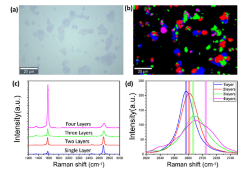 圖6.拉曼映射圖像的生成。(a) OM和(b)相同區域的拉曼映射圖像。(c,d)在(c)寬拉曼位移區和(d)窄拉曼位移區中不同數量的石墨烯層的拉曼光譜。