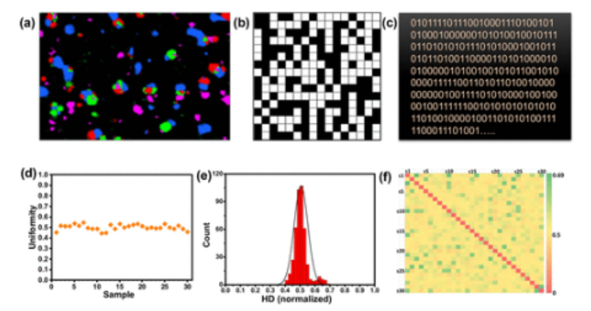 圖7.密鑰的生成和PUF性能參數的計算。(a) 所選多層石墨烯襯底的拉曼映射圖像。(b,c)用于生成安全密鑰的圖像的二值化和尺寸減小。(d) 30個多層石墨烯襯底的均勻性。(e) 漢明距離分布(HDINTER)。(f) 30種不同PUF的HDINTER值的成對比較圖。