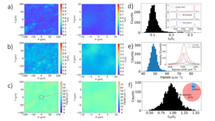 G和(c)fwhm的均勻性。(d) 獲得了具有AB堆疊、SLG和少量層特征的石墨烯的拉曼光譜。(e) fwhm的統計分布,其中插圖顯示了AB堆疊雙層石墨烯的2D洛倫茲擬合。(f) I