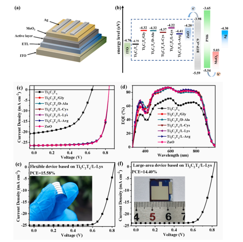 x/L-Lys為ETLs的PM6:BTP-eC9 (e)柔性器件和(f)大面積(0.99 cm