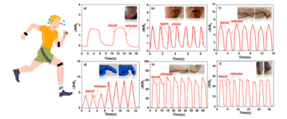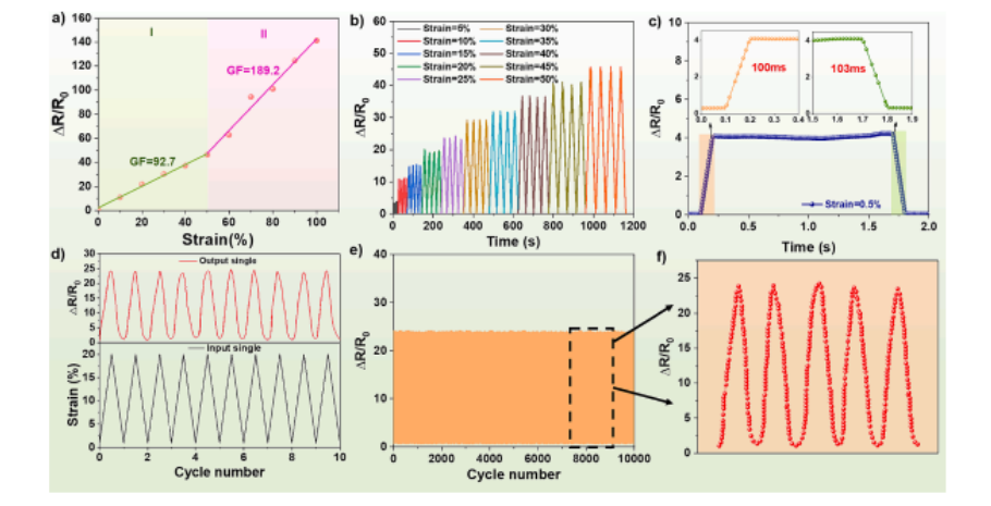 2復合材料的傳感性能,表現為優異的靈敏度(GF = 189.2)、快速的響應時間(102 ms)和超過10,000個循環的良好重復性。該裝置具有良好的機械傳感性能,能夠準確地檢測人體生理信號。具體來說,該設備是一個應變檢測器,通過監測手指、手臂和大腿的運動來識別不同的應變信號。該研究為具有優異導電性、柔韌性和穩定性的復合材料制造提供了關鍵見解,而這些是創建高性能柔性傳感器的基本特性。