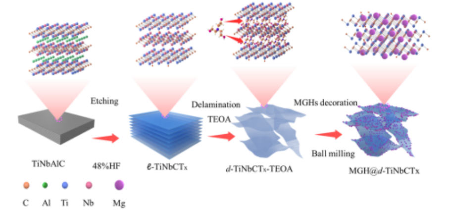 氫化鎂(MGH)是一種高容量、低成本的儲氫材料;然而,慢的動力學速率、高的脫氫溫度和短的循環壽命阻礙了其大規模應用。為了解決這些問題,我們提出了一種設計新型分層三維雙金屬MXene (d-TiNbCT