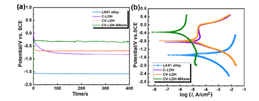 圖3. (a) OCP的演變和(b) LA51和所有膜層在3.5 wt % NaCl溶液中浸泡1 h后的極化電位動力學曲線的極化曲線。