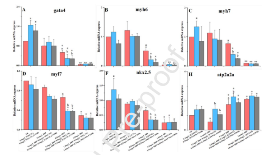 圖2. 觀察不同濃度DBP染毒及與MWCNTs/MWCNTs-COOG共染毒144hpf后斑馬魚胚胎/幼魚心臟發育毒性基因mRNA的相對表達量。