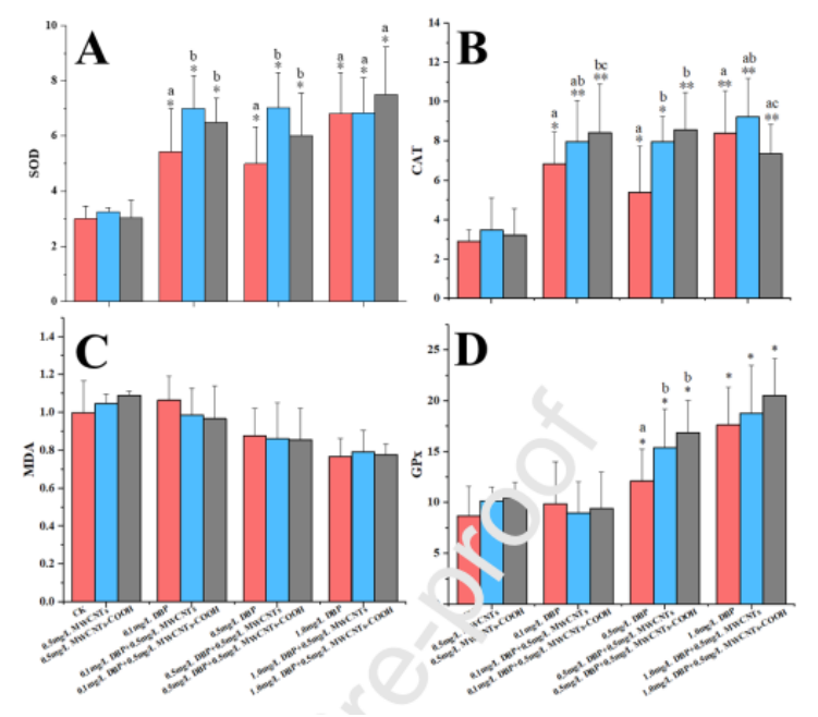 圖4. 不同濃度DBP染毒及與MWCNTs/MWCNTs-COOH共染毒144hpf后,斑馬魚胚胎/幼魚氧化應激相關基因的mRNA相對表達量。