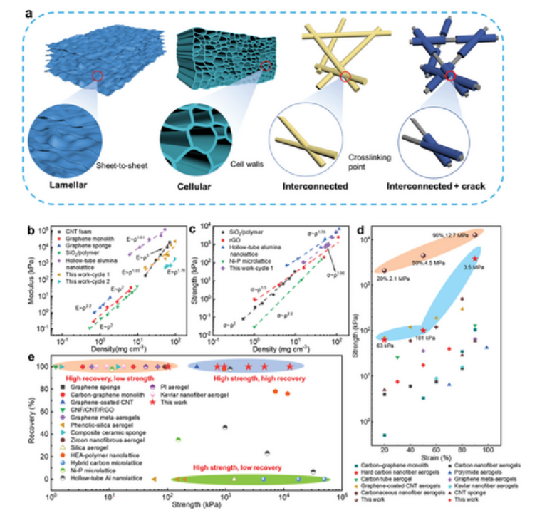 Fig 4. 與其他碳基、金屬基、陶瓷基和聚合物基多孔材料以及超材料的綜合比較(微觀結(jié)構(gòu)、強度、模量、恢復(fù))。 a)已報道的超彈性材料的三種典型微觀結(jié)構(gòu)以及本工作中設(shè)計的結(jié)構(gòu); b-c) 楊氏模量、屈服強度與CNT@AC表觀密度之間的比例關(guān)系; d) Ashby 圖繪制了 CNT@AC 和其他先前報道的超彈性材料在不同應(yīng)變下的強度; e) CNT@AC 的強度和恢復(fù)能力之間的比較CNT@AC等多孔材料。碳基, 陶瓷基,聚合物基氣凝膠,和超材料(納米晶格、微晶格)]被選擇。
