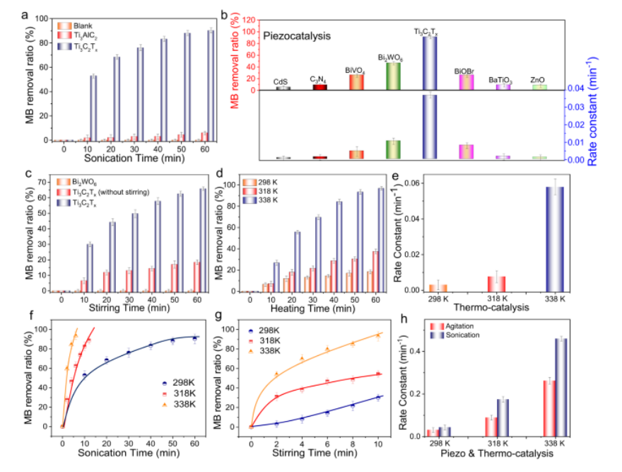 Fig 3. MB 的催化降解。 a Ti3AlC2 和 Ti3C2TX 降解亞甲基藍 (MB) 的壓電催化效率。 b 超聲處理 60 分鐘后不同極性半導體的 MB 去除率和相應的速率常數。 c 在黑暗中連續攪拌(1000 rpm)、298 K 下不同樣品上 MB 的壓電催化降解。 d, e MB 在 Ti3C2TX 上的熱催化降解以及相應的速率常數。 f–h Ti3C2TX 上 MB 的壓電熱催化降解和相應的速率常數。 (a-h)中的所有數據均收集了3次,誤差線代表標準差。