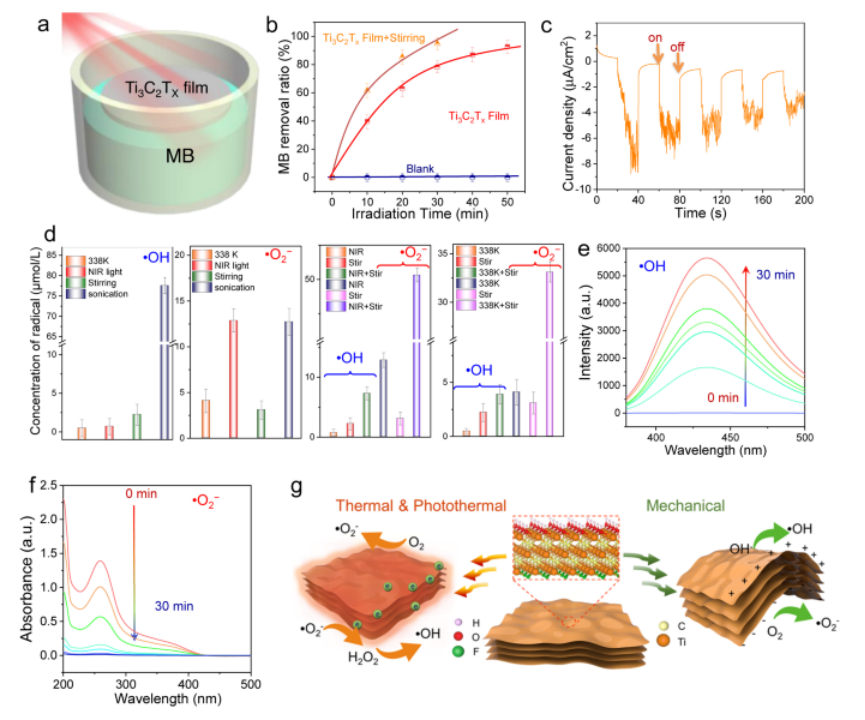Fig 4. Ti3C2TX 光熱催化降解 MB 及反應機理a 光熱催化測試示意圖。b 在700-1200 nm近紅外光照射下MB的光熱催化降解。 c Ti3C2TX 在超聲處理下的瞬態電流響應。 d 30 分鐘內不同反應條件下Ti3C2TX 上•OH 和•O