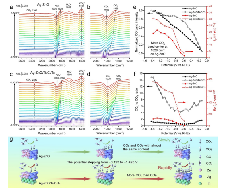 CO,f) 從 ATR-IR 光譜得出的 COL 與 COB 帶強度比以及 Ag-ZnO 和 Ag-ZnO/Ti3C2Tx 的質量比活度。 g) Ag-ZnO和Ag- ZnO/Ti3C2Tx表面eCO2R的示意圖。