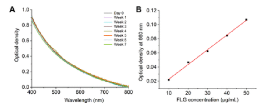 圖2. (A) GrNP分散體在EtOAc中7周的消光光譜;(B) EtOAc中的消光系數(ε