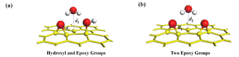 圖2. (a)羥基和環氧基團(b)兩個環氧基團的氧化石墨烯和Copper -GO的C-O距離(d