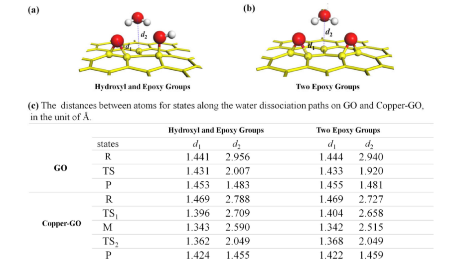 2)示意圖。(c)沿著GO和Copper-GO的水解離路徑,d