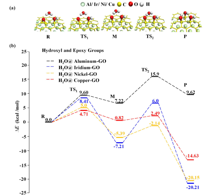 圖4. (a)GO上一對羥基和環氧基團在水解離途徑中不同狀態的示意圖,GO由(111)表面支撐,金屬襯底包括鋁(Al)、銥(Ir)、鎳(Ni)和銅(Cu)。(b)不同金屬襯底支撐GO上水解離途徑的比較。Copper-GO的結果與圖1(b)相同。為了便于比較,將R的能量值移到0。