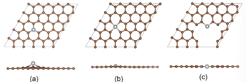 圖1. 優化的Ni摻雜的單空位(a)、雙空位(b)、邊緣空位(c)石墨烯的俯視圖(上)和側視圖(下)。