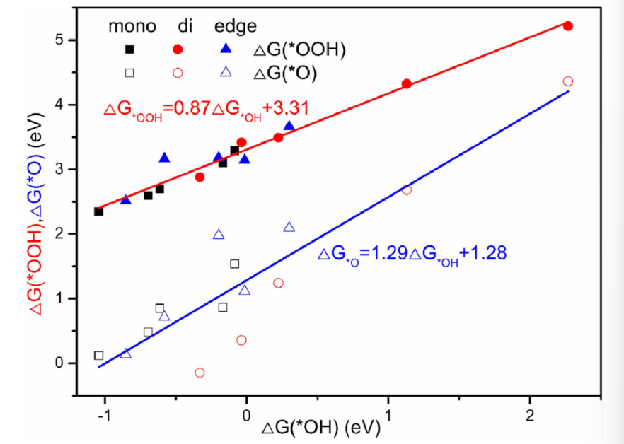 圖3. 在缺陷石墨烯上摻雜各種金屬原子的ΔG*OOHΔG*O和ΔG*OH之間的線性關系。