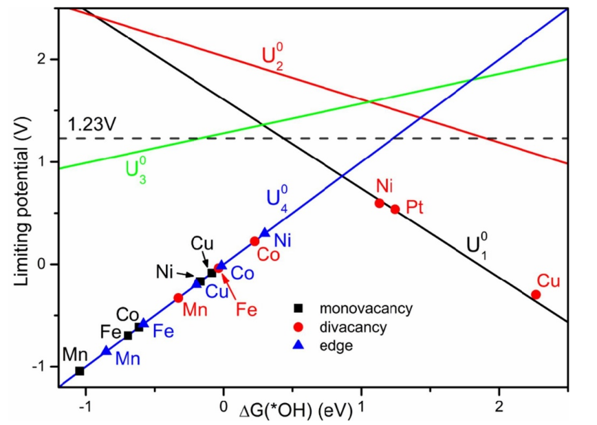 近年來,制備出了摻雜在石墨烯空位缺陷上的單Pt原子,并表現出優異的氧還原反應活性和耐久性。在這里,我們選擇它作為基準來尋找類似甚至更好的催化劑,進行密度泛函計算來探索五種單一的三維過渡金屬(Mn, Fe, Co, Ni, Cu)摻雜在缺陷石墨烯上用于ORR的可能性。研究了相應的穩定性和ORR活度。結果表明,純缺陷石墨烯可以作為襯底穩定所選的5種單一過渡金屬。反應中間體的吸附自由能相互標度,并以此為基礎得到活火山圖。在所有結構中,摻雜在空位石墨烯上的Ni原子表現出最低的理論過電位,甚至優于實驗中摻雜在空位石墨烯上的Pt單原子。