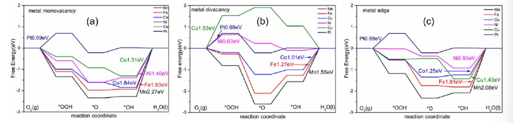 圖5.在1.23 V時在(a) M/MV (b) M/DV (c) M/EV上與標準氫電極的ORR的吉布斯自由能圖。