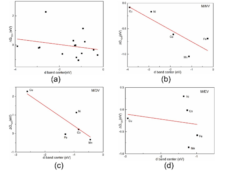 圖6. (a) 15個缺陷石墨烯支撐的過渡金屬原子d能帶中心與*OH吸附自由能的關系(b)過渡金屬摻雜單空位石墨烯,(c)過渡金屬摻雜雙空位石墨烯,(d)過渡金屬摻雜石墨烯邊緣空位。