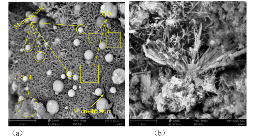 圖9. 混凝土中微膠囊和氧化石墨烯的微觀形態(tài):(a)整體形狀和(b)具體形態(tài)。