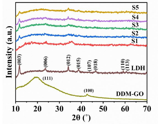 圖2. DDM-RGO/LDH、LDH和DDM-GO的XRD譜圖。
