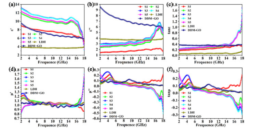 圖7. S1、S2、S3、S4、S5、LDH和DDM-GO的電磁參數。