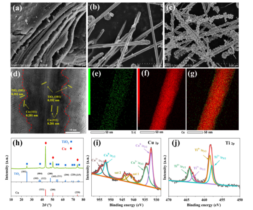 2−x納米顆粒的銅納米線。(d) Ti、Cu的HRTEM圖像和((e)-(g)) EDX元素映射以及兩種元素的重疊。(h) TiO