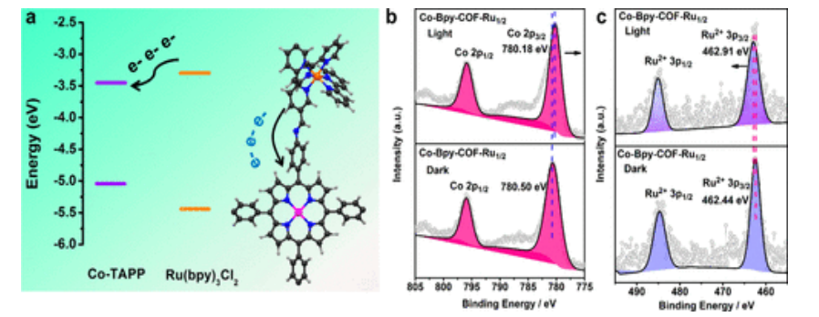 Fig 3. (a) 單體與 HOMO 和 LUMO 的相關(guān)能級; (b,c)Co-Bpy-COF-Ru