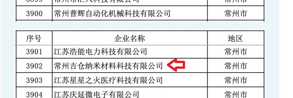 據江蘇省科技廳官網、常州市科技局高新處消息,《創新常州》公眾號發布,常州吉倉納米材料科技有限公司入常州科技型中小企業名單,共有596家我常州吉倉名列其中。