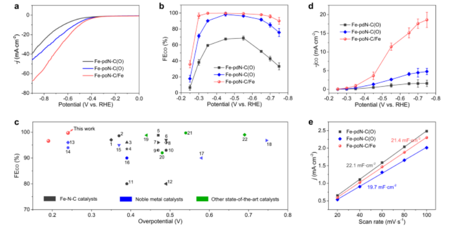 2 還原性能。 a FepdN-C(O)、Fe-poN-C(O)和Fe-poN-C/Fe的LSV曲線。 b FECO 在 FepdN-C(O)、Fe-poN-C(O) 和 Fe-poN-C/Fe 的不同施加電位下。 c Fe-poN-C/Fe 的 ECR 性能與典型電催化劑的比較。 d jCO 在不同施加電位下的分布以及 (e) Fe-pdN-C(O)、Fe-poNC(O) 和 Fe-poN-C/Fe 的雙層電容。 H-cell 中的所有測量均在 CO