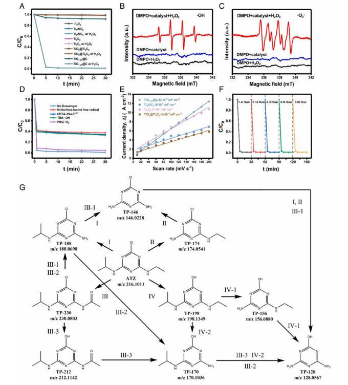2 相比的估計雙層電容。 (F) 五次運(yùn)行的類芬頓降解效率的穩(wěn)定性評估。 (G) 提出的atrazine類芬頓降解途徑,然后通過 UHPLC-QTOF-MS 鑒定了幾種中間體。條件:[Ti] = 0.1 g L