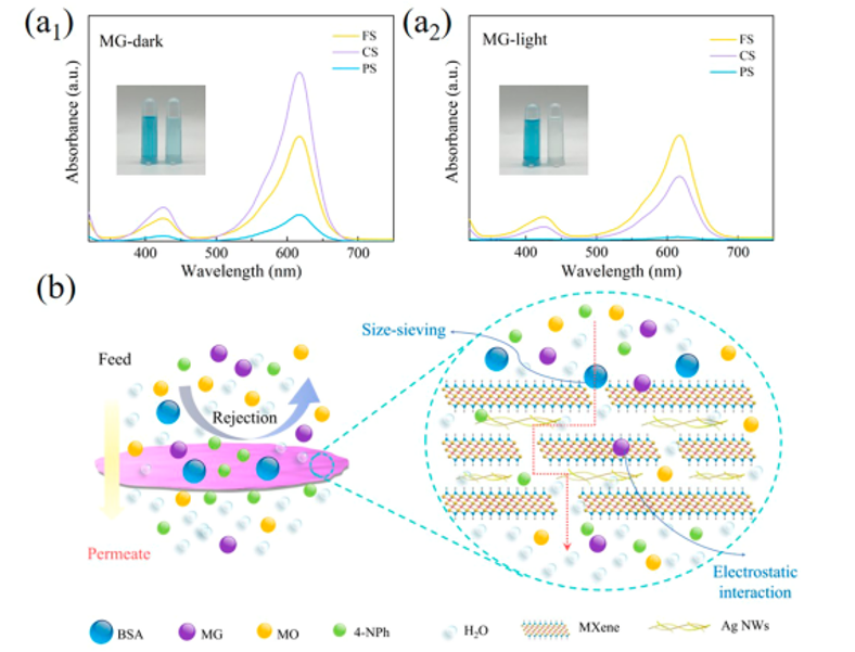 圖6. (a)在暗和光條件下,通過M@A-16%膜過濾的飼料,滲透和濃縮MG溶液的UV-vis光譜,(b) M@A膜分離廢水機理示意圖。